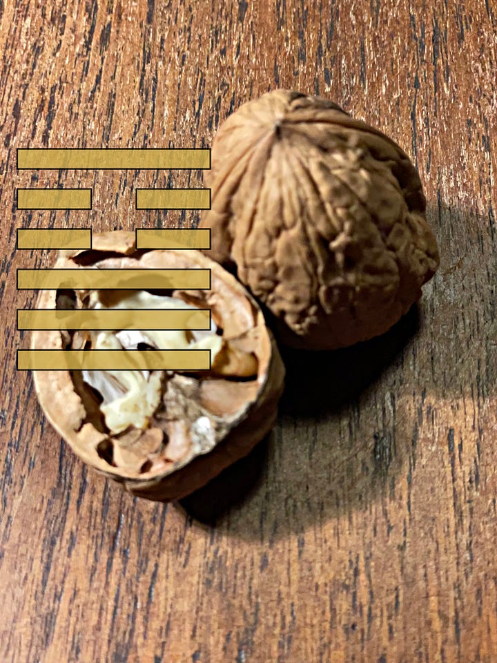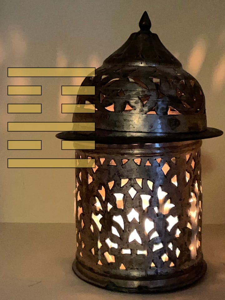 Het kan weer zes kanten op. Als de eerste lijn omslaat, dan verandert de Schoonheid terug in dat, waar we begonnen, Het Stilhouden. Een veranderende tweede lijn leidt tot Accumulatie. Een derde tot Voeding, een vierde tot Licht, een vijfde tot Familie, en zou de bovenste lijn veranderen, dan beweegt de situatie zich naar De Verduistering van het Licht.