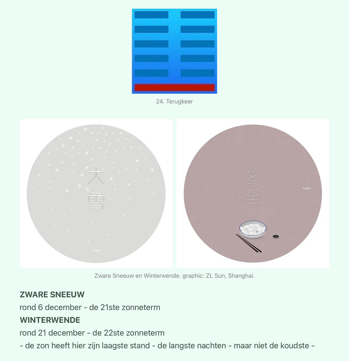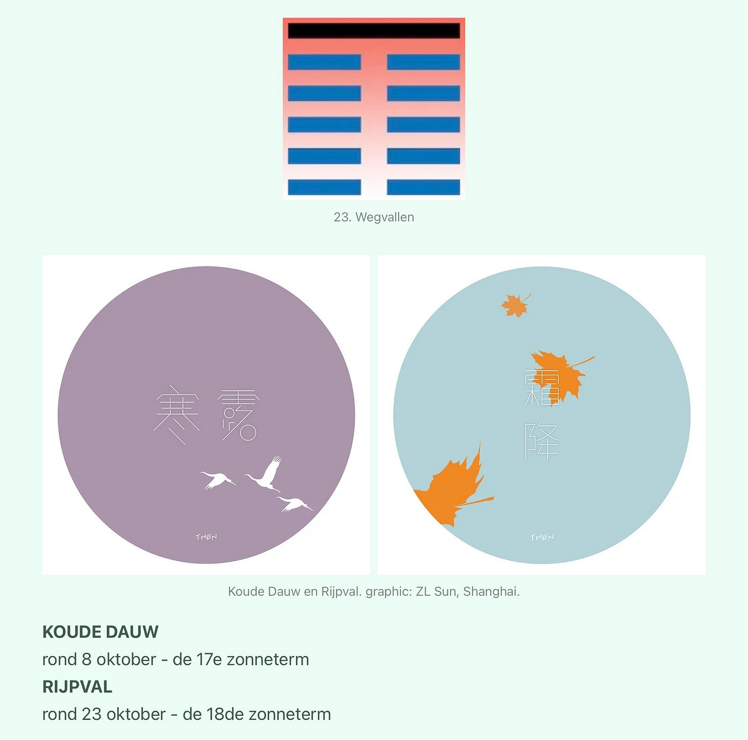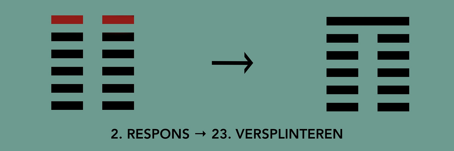 Hoofdstuk 23. Versplinteren beschrijft de dynamiek tussen verzamelen en uit elkaar vallen. Zoem je iets uit, dan zie je ditzelfde spanningsveld al terug in de relatie tussen hoofdstuk 24. Terugkeer en hoofdstuk 23. Versplinteren. Waar in het hexagram van de een de actieve lijn van onderaf binnenkomt, verdwijnt diezelfde lijn in het hexagram van de andere aan de bovenzijde.