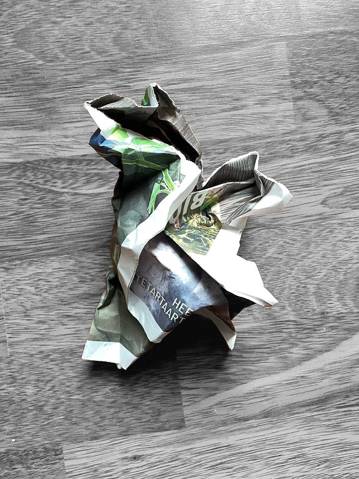 Naar huis gesleept. Tassen en dozen vol. Dagelijks thuisbezorgd in karton en plastic. Wat volgt is het Grote Scheiden: het waardevolle in de voorraadkast en achter slot en grendel. Verpakkingen en schillen achteloos in de afvalemmer. Stel je het omgekeerde eens voor: de schillen in de pan en de aardappels in de kliko.