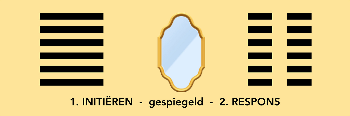 Er zijn acht hexagrammen die symmetrisch zijn opgebouwd. Als je hun lijnenpatroon omkeert, is het resultaat identiek. Dit is het geval bij: 1. Creatie 2. Respons