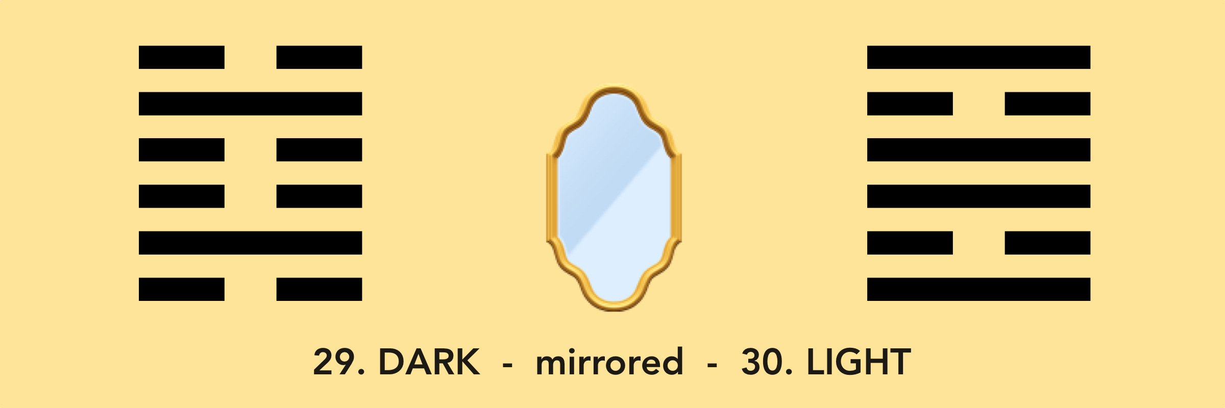 Water and Fire, Dark and Light. In chapters 29 and 30 the worlds of the subconscious and the conscious are described. But not as two domains that exclude each other and are separated by a hermetic barrier. The trigram of Water consists mainly of formless, transparent lines. In their midst is that one light line, that of consciousness. The trigram of Fire has an abundance of bright lines, with that one broken line in their midst, connecting them to the incongruity of memory, scent, instinct, and dreams.