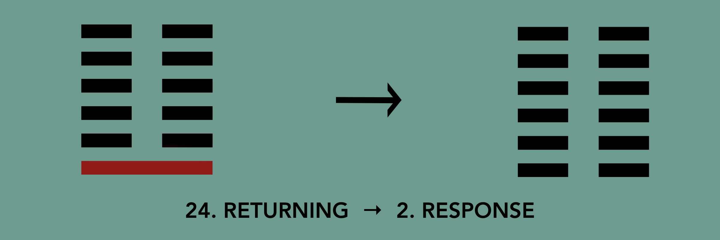 Six broken lines. Earth below, Earth above. Returning changes into Response. The latter is the title of one of the two opening chapters of the book. A response following an initiation. An echo to a sound. And if creation did indeed begin with a single word, then chapter 2 describes the subsequent answer.