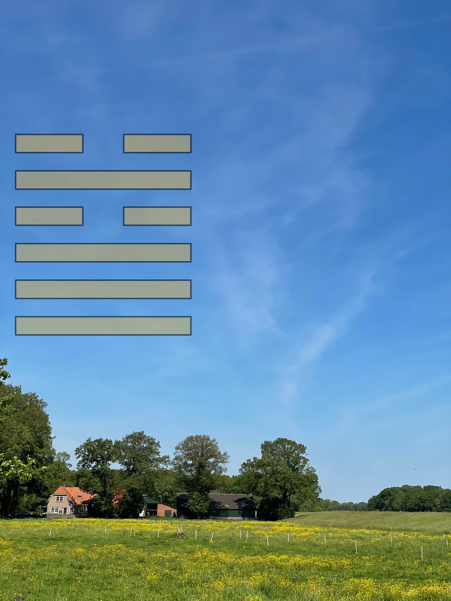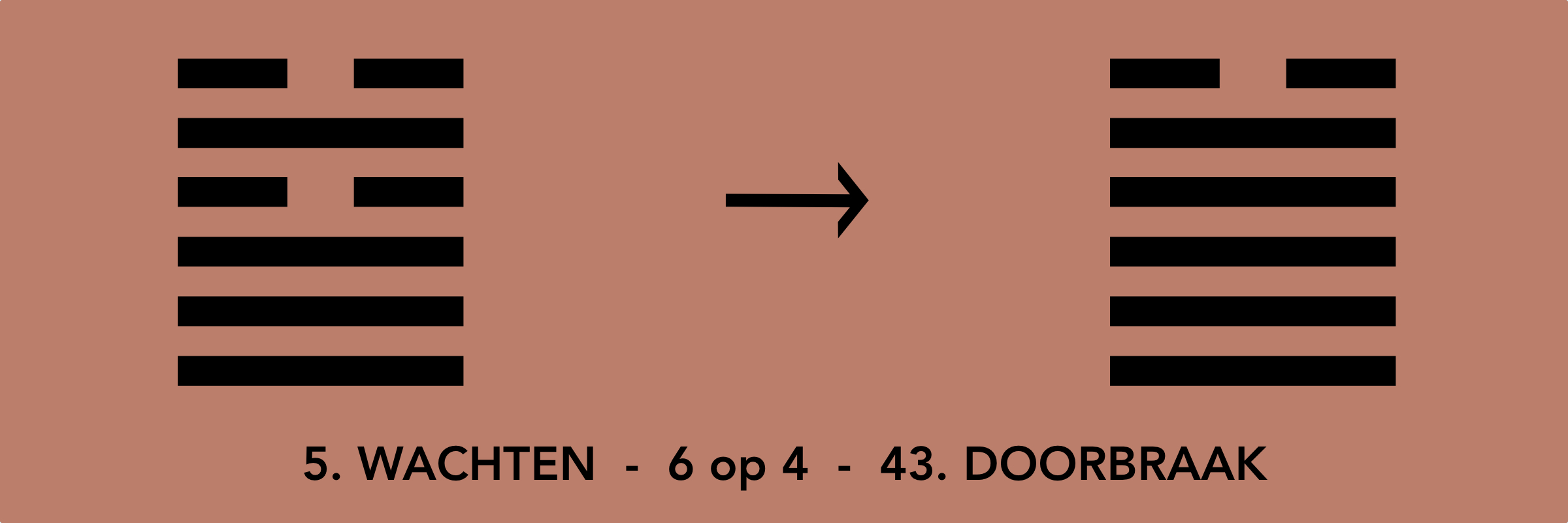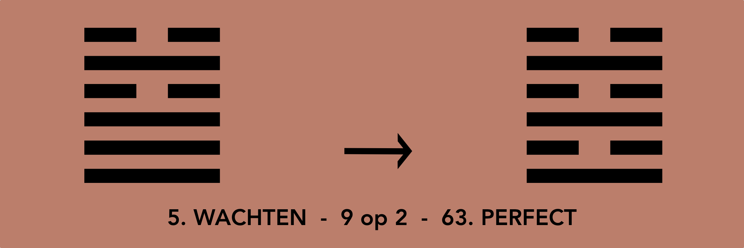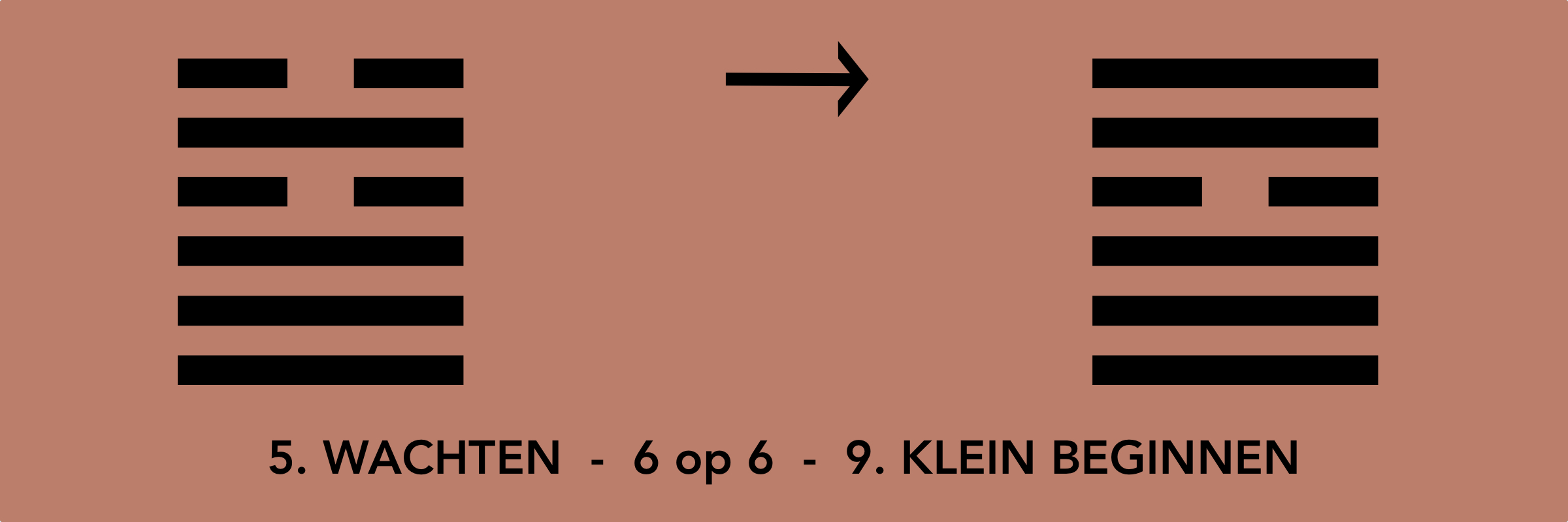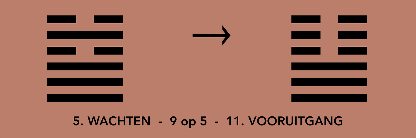 HET BEELD van twee trigrammen: boven Water, onder Hemel. Er zit vocht in de lucht. Genoeg voor een hoge dunne wolkensluier. Lang niet voldoende voor een malse regenbui. En daar gaat het uiteindelijk om: wat zouden we moeten zonder water. Water is de primaire voorwaarde voor ieder leven, voor iedere samenleving. Er zit daarom niets anders op dan te wachten. Geduld uit te oefenen tot betere tijden.