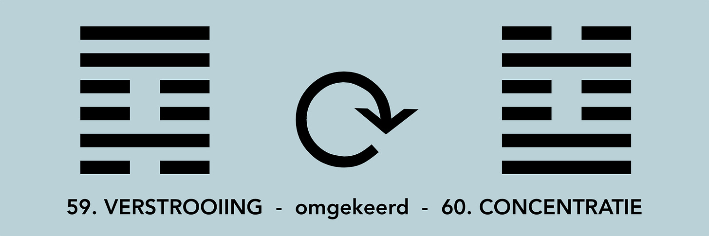 HET BEELD van twee trigrammen: beneden het Meer, boven Water. Water dat een meer vult. Water in een kom of fles: het is het vloeibare dat naadloos de vorm aanneemt van het omhulsel. Water binnen een bedijking: dat wat vanuit zichzelf geen samenhang heeft, wordt bijeen gehouden door een begrenzing. De begrenzing van het meer bepaalt tevens hoeveel water het kan bevatten, het bepaalt de limiet. Zonder begrenzing en limitering is beheersing niet mogelijk. Water boven, Meer onder: het beeld van beheersing en concentratie.