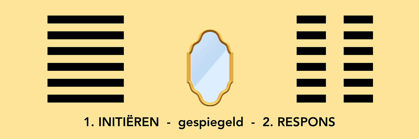 Hoofdstuk 1, zijn betekenis gecondenseerd in zes sterke lijnen, en hoofdstuk 2, gesymboliseerd door zes ontvangende lijnen, bevatten de essentie van het Boek van Verandering. Het begrijpen van hun interrelatie geeft de sleutel tot wat later in het boek volgt, de ontelbare potentiële veranderingen die het leven in petto heeft. Alles begint met initiëren, alles is afhankelijk van respons.