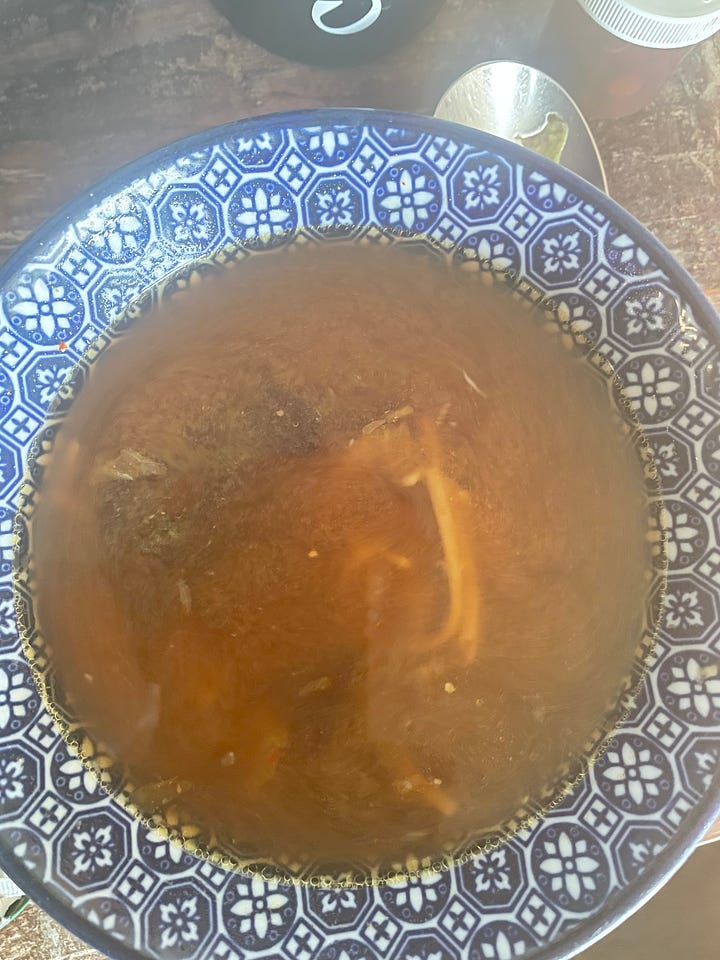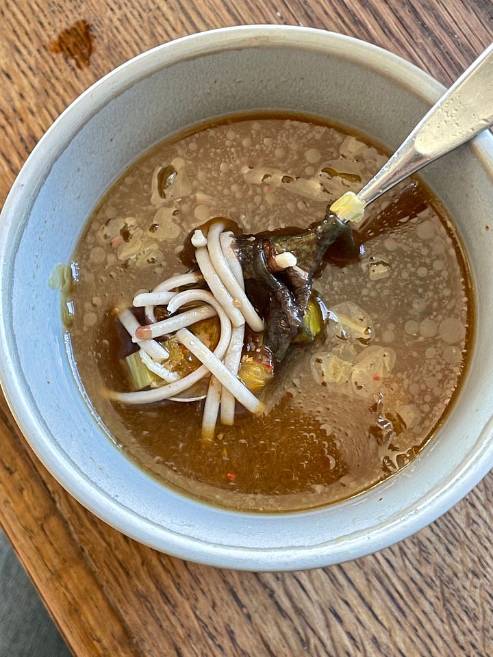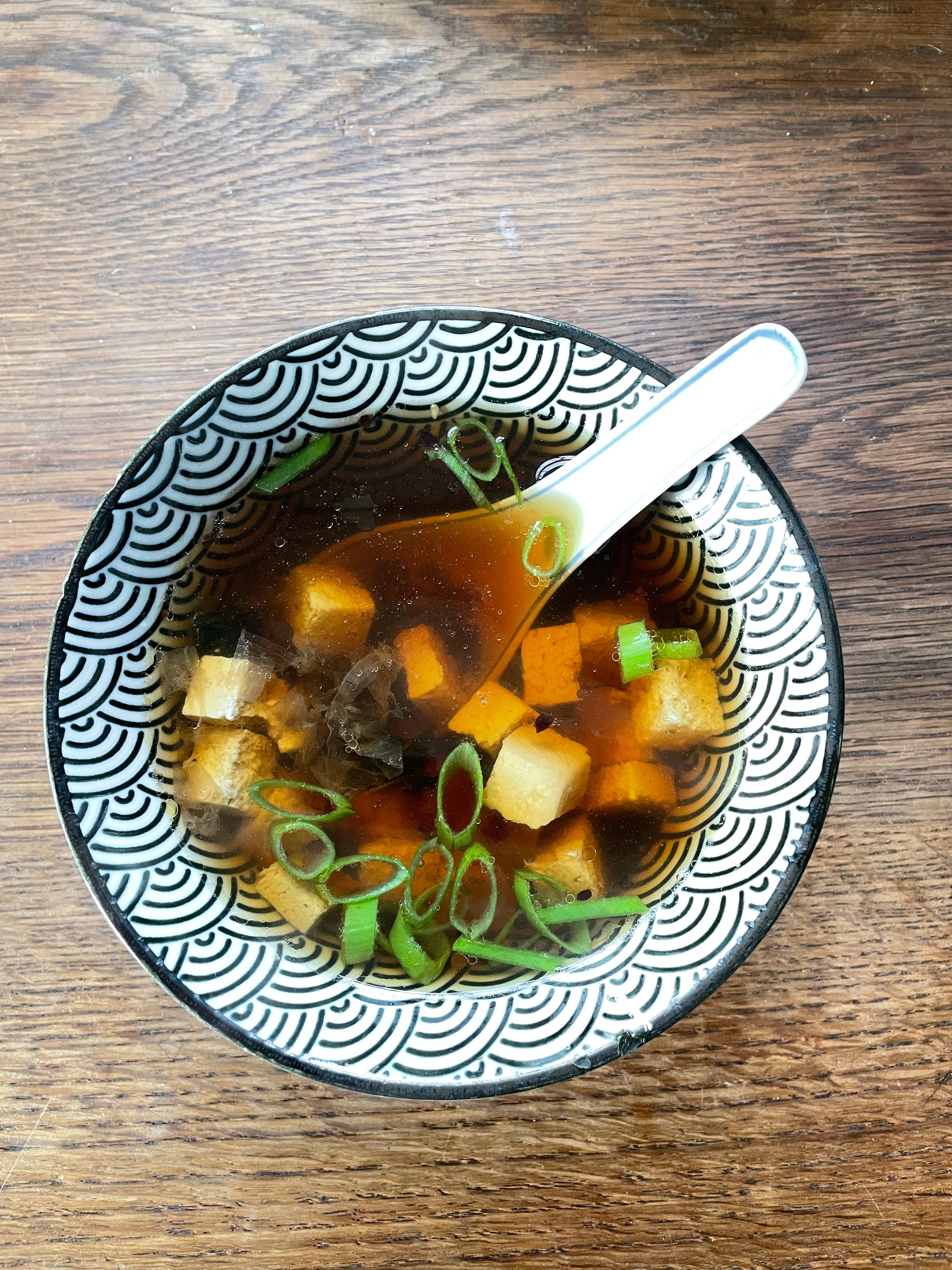 Vanochtend: shoyu - het zusje van miso - tofu, wakame, bonito vlokken, lente ui …