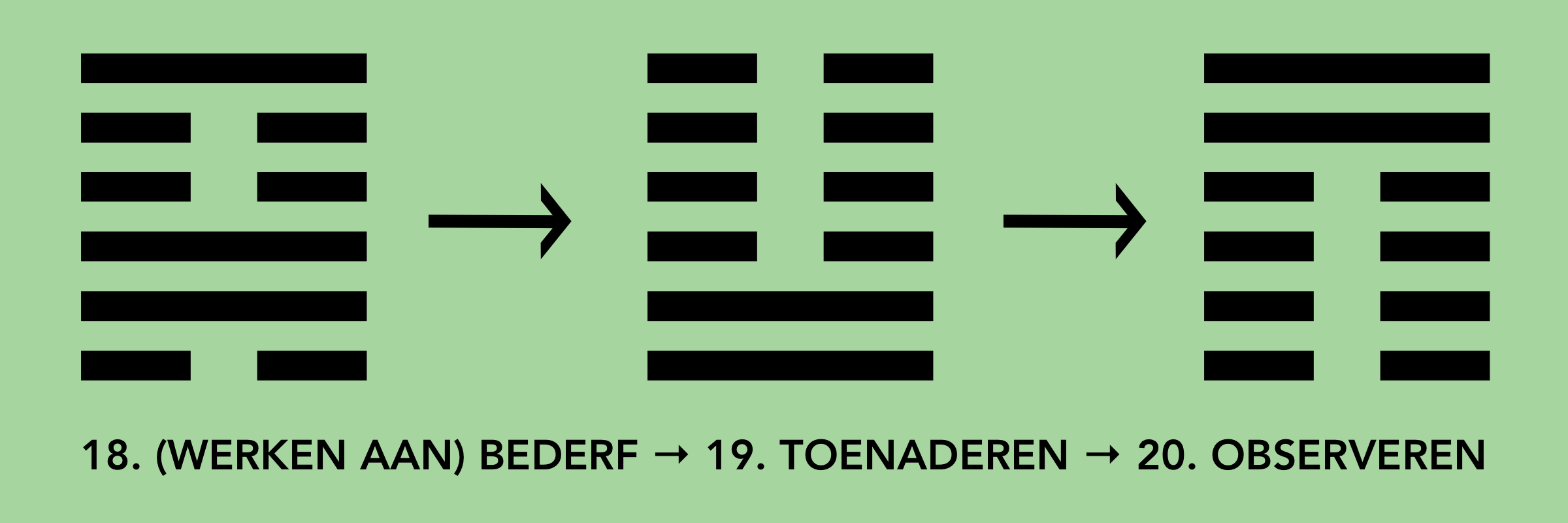 Het grote gaat hand in hand met het kleine. Kom dichter bij jezelf, verzacht de neiging om steeds het andere te ambiëren willen, ontdoe je van onnodige ballast en er ontstaat meteen ruimte om vrijer te observeren. De inhoud van hoofdstuk 18. Bederf (of Werken aan het Bederf) leidt naar dat van hoofdstuk 19. Toenaderen, wat op haar beurt toegang geeft tot de inhoud van dit hoofdstuk 20. Observeren.