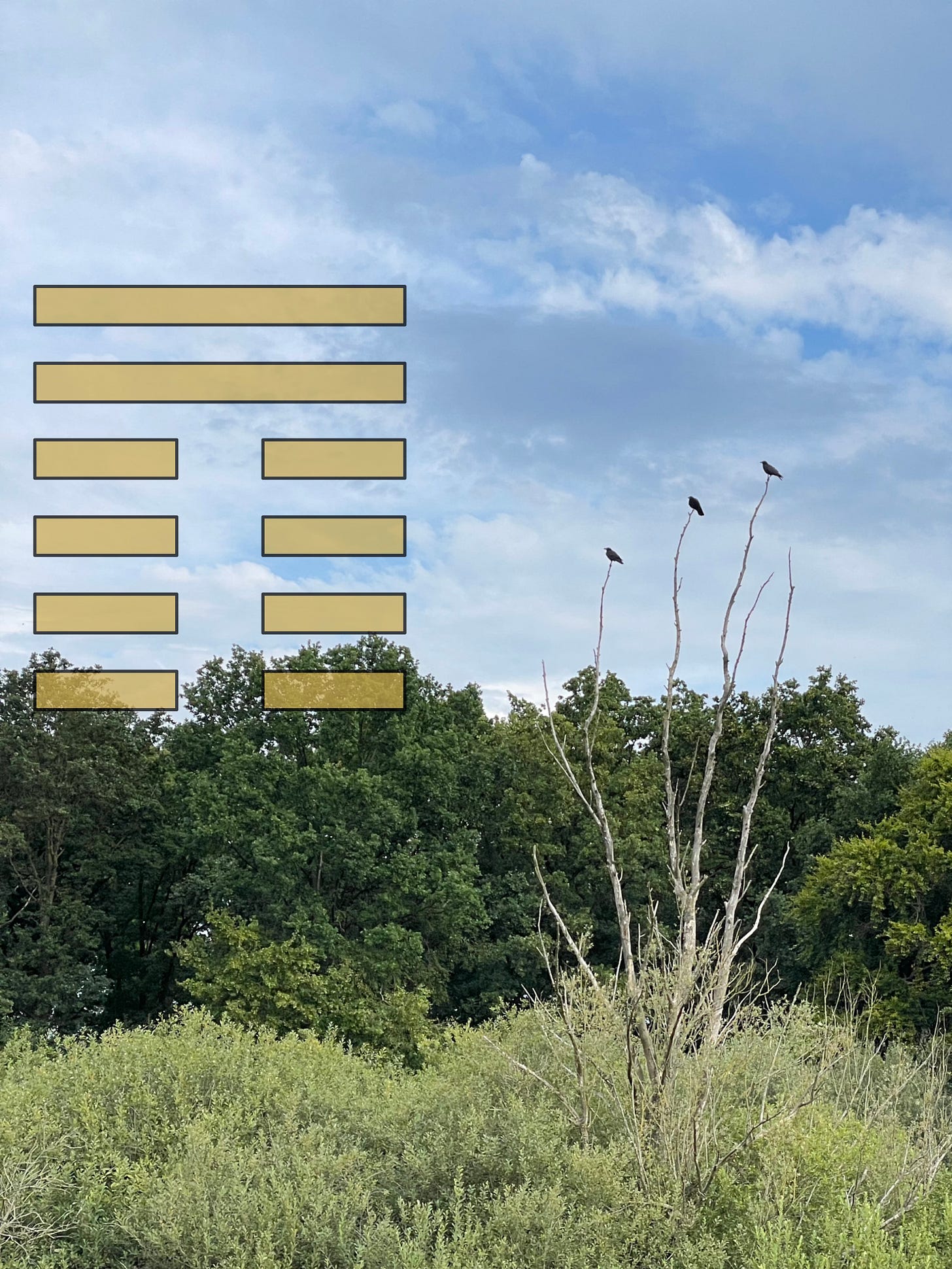 HET BEELD van de twee trigrammen: boven Wind, onder de Aarde. Een zachte bries die over de aarde waait. Ze beroert alles, raakt alles aan, maar laat de dingen zoals ze zijn. Wind over Aarde: het beeld van Observeren. De dingen waarnemen zoals ze zijn en niet zoals je zou willen dat ze zijn. Of objectieve waarneming bestaat? Of je zonder enige bijbedoeling - als de wind - kunt aanraken? Is dat wel weggelegd voor een mens?