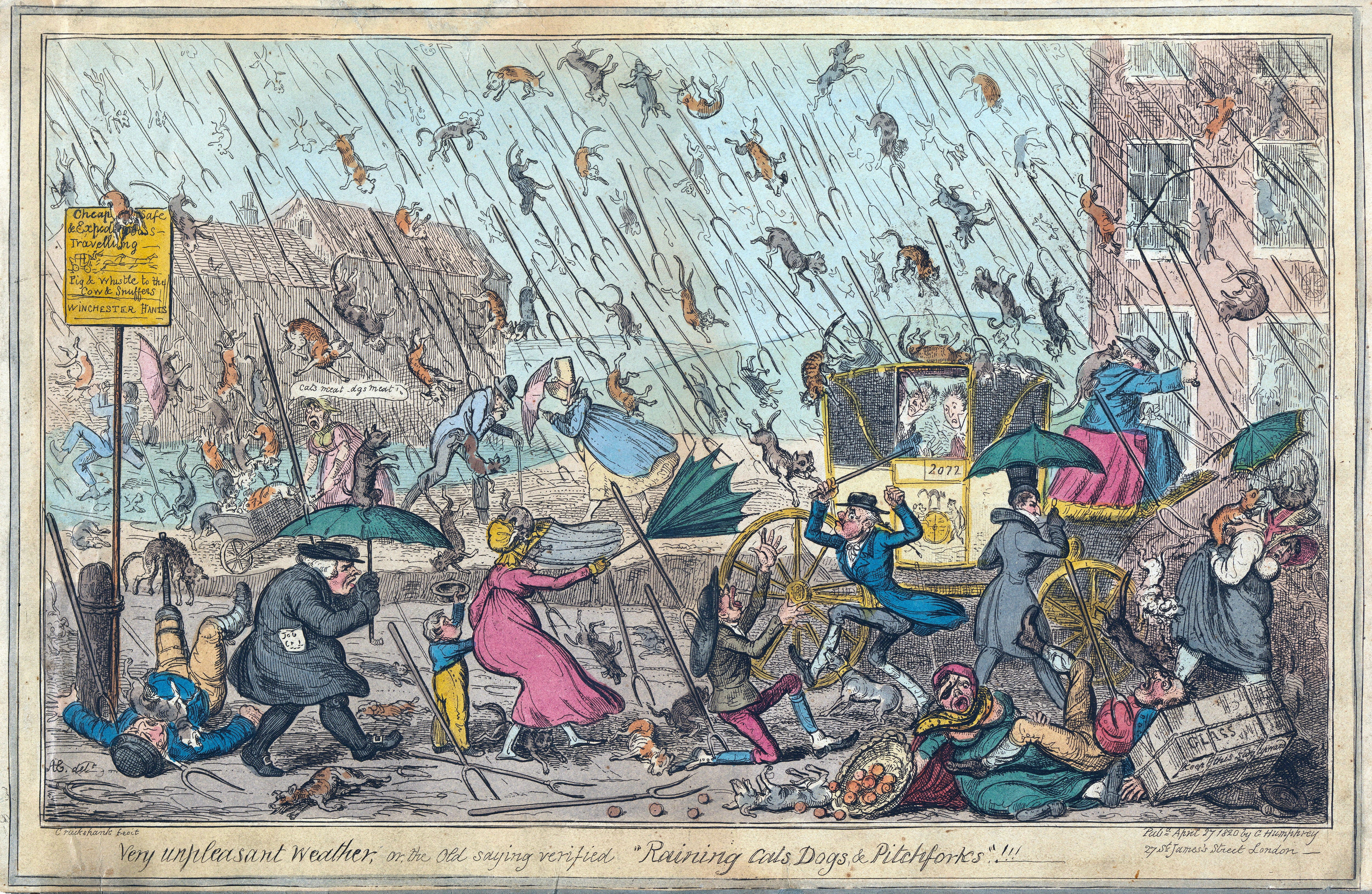 A 19th-century cartoon by English artist George Cruikshank illustrating the phrase “raining cats and dogs” (and “pitchforks”)