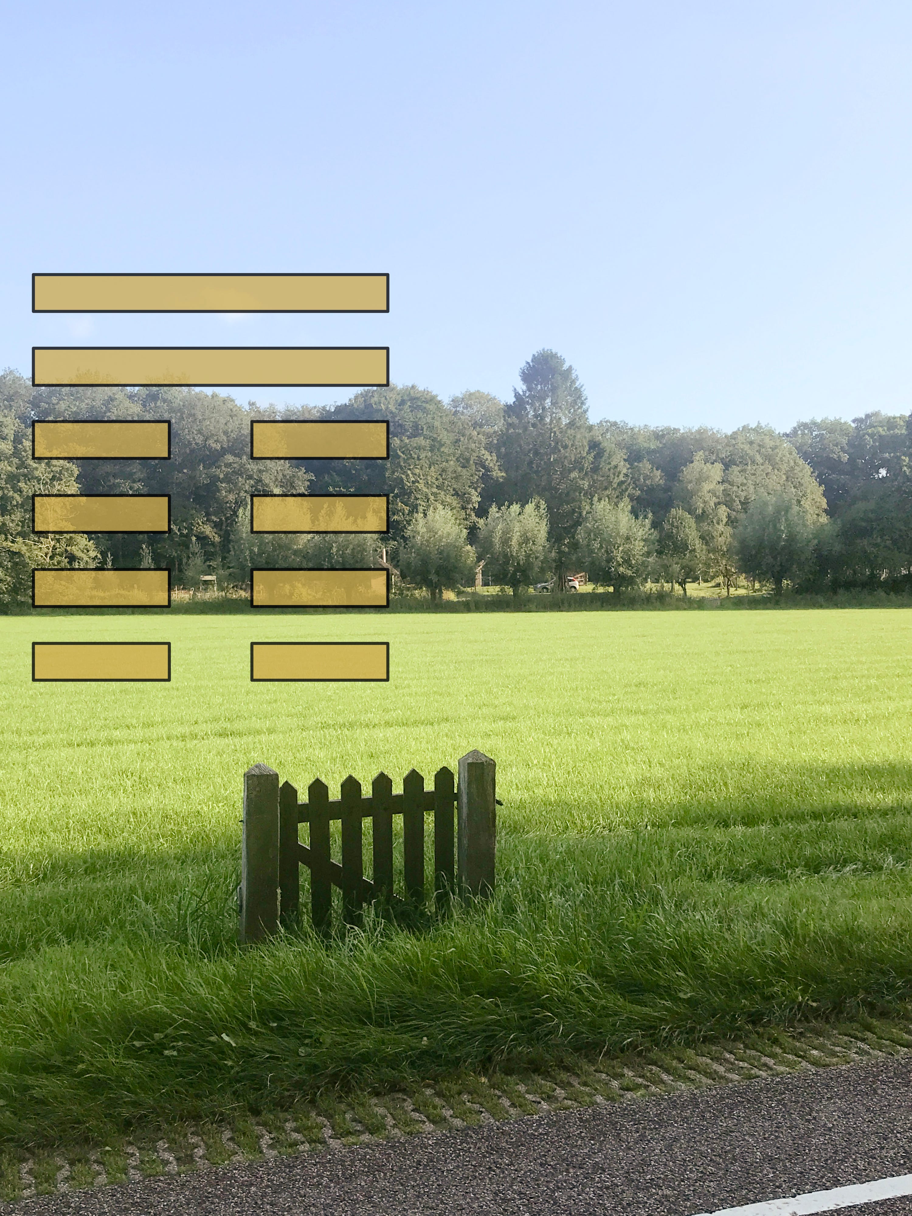 HET BEELD van het hele hexagram: een poort. Zodra die geopend is, biedt hij uitzicht op de wereld die daar achter ligt. De poort is tevens het kader, dus lang niet alles is zichtbaar. Slechts een uitsnede, een kleine selectie wordt waargenomen. De open poort is als onze zintuigen, onze ogen. Ze zien en ze zien over het hoofd.