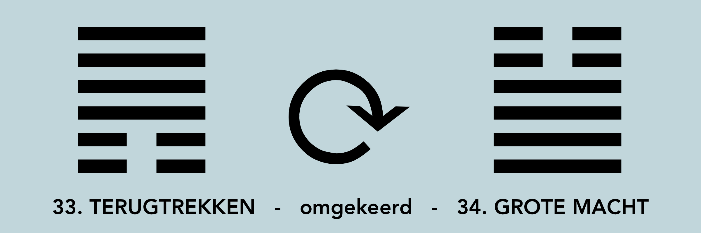 Wordt het hexagram van hoofdstuk 33 omgekeerd dan verschijnt dat van hoofdstuk 34. Grote Kracht. Om bij die grote kracht te komen beweeg je in een tegenovergestelde richting. Dat heet ‘investeren in het tegendeel’. Om te springen moet je eerst door de knieën gaan. Winst wordt mogelijk door eerst het verlies te aanvaarden. Grote kracht ligt besloten in het terugtrekken.