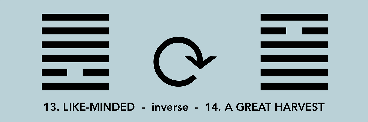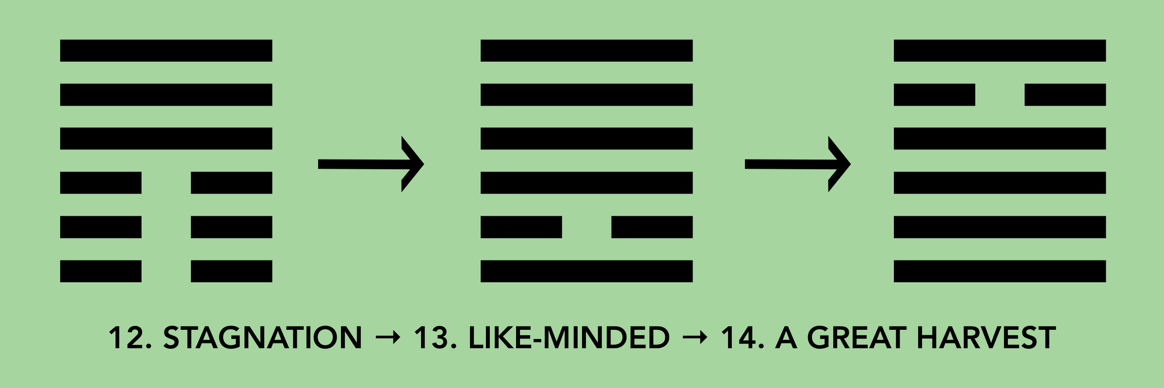 Chapter 13. Like-minded follows Chapter 12. Stagnation. The hexagram of Stagnation is clear: it consists of three broken lines below, and three solid lines above. Heaven above Earth. At first glance, this seems like the perfect configuration, everything is in its designated place. Until you realise that the situation described therefore lacks all momentum. Heaven moves upwards, but was already at the top. Earth moves down, but was already there. Heaven and Earth are separating, there is alienation and a status quo. The rich getting richer and the poor getting poorer. The appropriate response when life is stagnant lies in seeking like-minded people and forging coalitions. Cooperation is always the winning strategy in human development, especially in times of stagnation.
