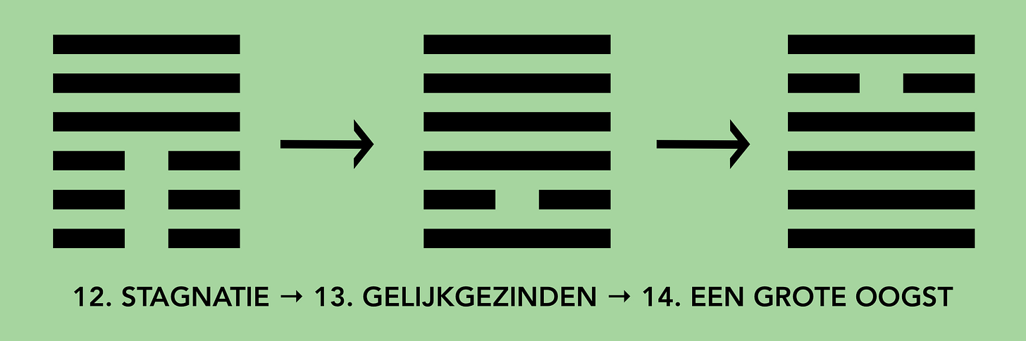 Hoofdstuk 13. Gelijkgezinden volgt op hoofdstuk 12. Stagnatie. Het hexagram van Stagnatie is overzichtelijk: het bestaat uit drie gebroken lijnen beneden, en drie ononderbroken lijnen boven. De Hemel boven de Aarde. Op het eerste gezicht lijkt dit de perfecte configuratie, alles bevindt zich op de aangewezen plek. Tot je je realiseert dat de beschreven situatie het daarom aan alle dynamiek ontbreekt. De Hemel beweegt naar boven, maar was al boven. De Aarde beweegt naar beneden, maar was daar al. Hemel en Aarde bewegen uit elkaar, er is vervreemding en een status quo. De rijken die rijker worden en de armen armer. Het aangewezen antwoord wanneer het leven stagneert, ligt besloten in het zoeken naar gelijkgezinden en in het smeden van coalities. Samenwerking is altijd de winnende strategie in de menselijke ontwikkeling, zeker in tijden van stagnatie.