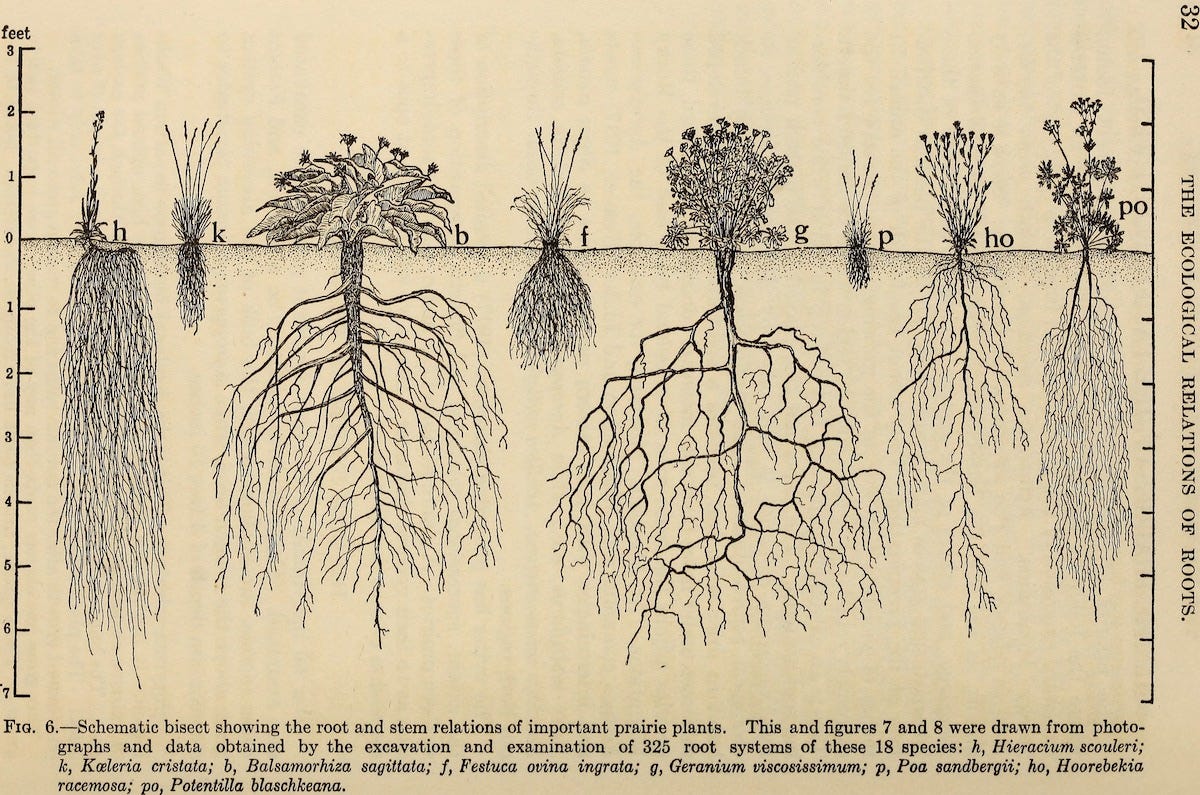 Botanist John Weaver (1884-1966) developed a laborious, painstaking technique for exposing and drawing a network of prairie roots in situ--a labor that must have suited his own precise personality for he conducted his field research wearing a three piece suit and a green eyeshade, like some accountant who had lost his way in the country. He drew the roots in great detail, documenting them at depths of up to fifteen feet from the ground surface.