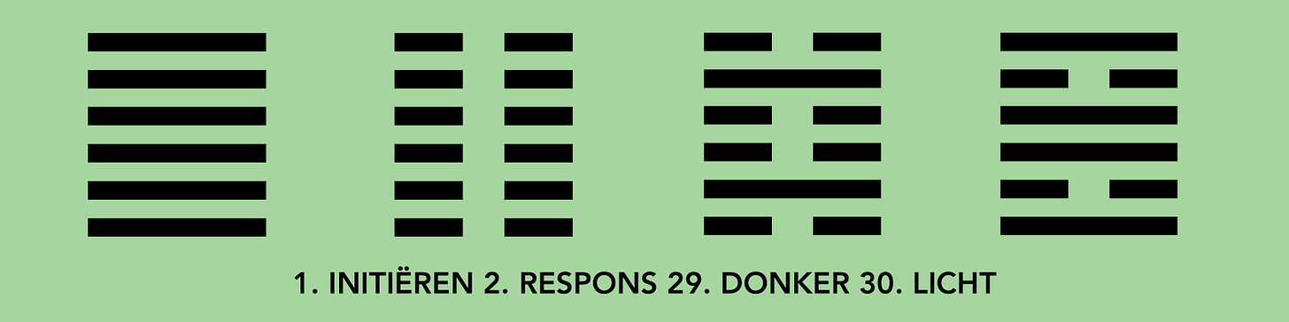 Het begin en het einde van het eerste deel worden door vier archetypische natuurlijke fenomenen gemarkeerd: Initiëren, Respons, Donker en Licht. Wat deze gemeenschappelijk hebben, is een beeld dat een verdubbeling is van een trigram. Hoofdstuk 1. Initiëren bestaat uit twee keer het Hemel-trigram. Hoofdstuk 2. Respons uit twee keer het Aarde-trigram. Hoofdstuk 3. Licht uit een verdubbeling van het Vuur-trigram en Hoofdstuk 4. Donker uit twee maal het Water-trigram.