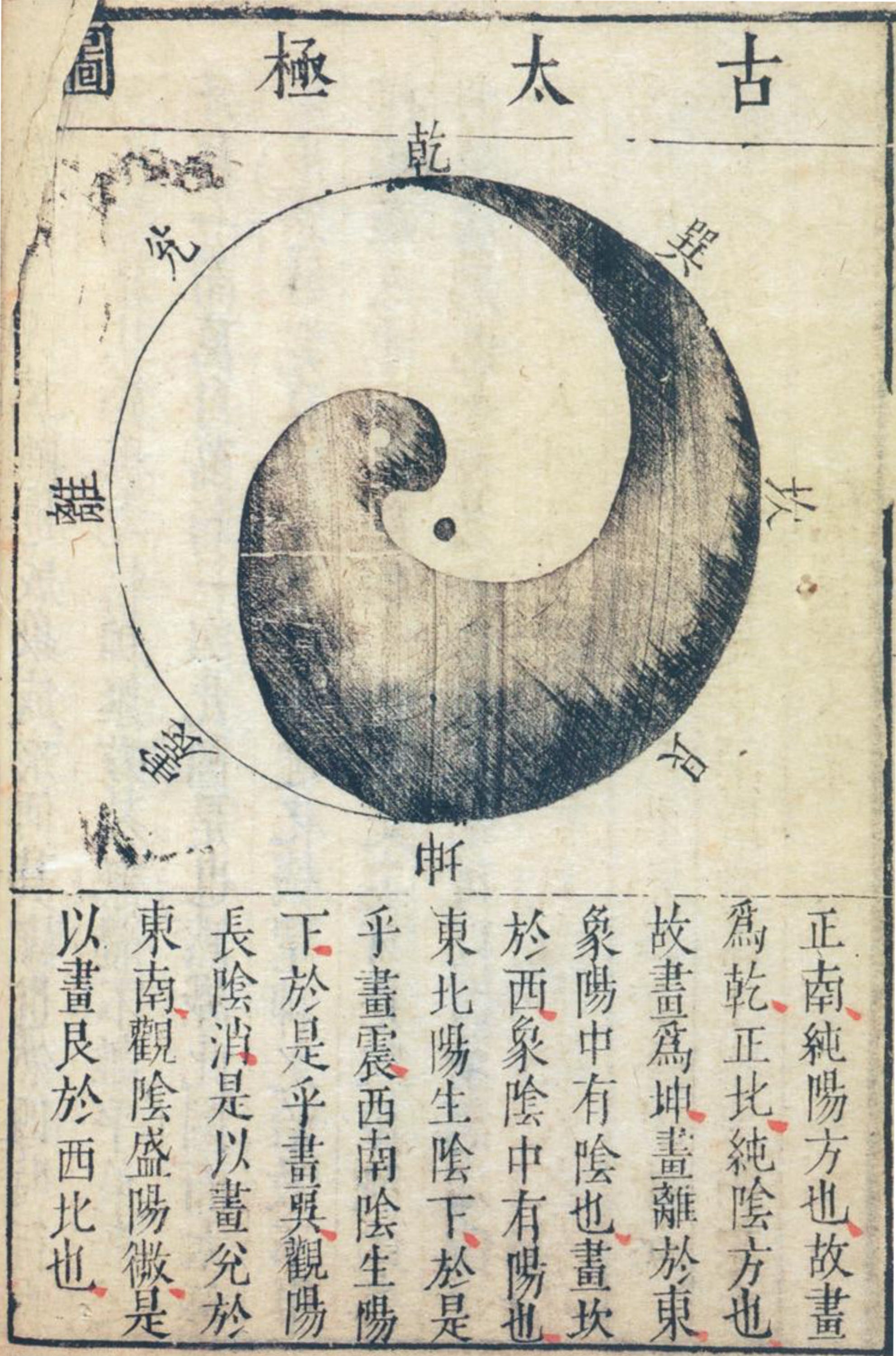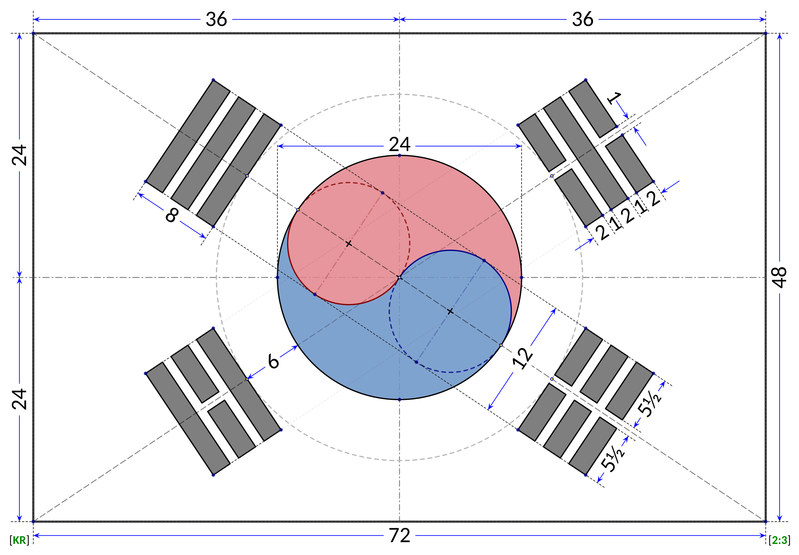 Op de nationale vlag van Zuid-Korea staan juist deze vier trigrammen afgebeeld. Rond de taegeuk, 태극, ‘het grote uiterste’. In het Mandarijn: taichi, 太極. Dit symbool, hier in de kleuren rood en blauw, verbeeldt het immer doorgaande spel van scheiding en aantrekking, de essentiële dynamiek van de schepping. De drie yang-lijnen tegenover drie yin-lijnen representeren zomer en winter. Een yang-lijn verborgen tussen twee yin-lijnen verbeeldt de herfst. Twee yang-lijnen met in hun midden een yin-lijn, het voorjaar. Bij elkaar vier gezichten van verandering.