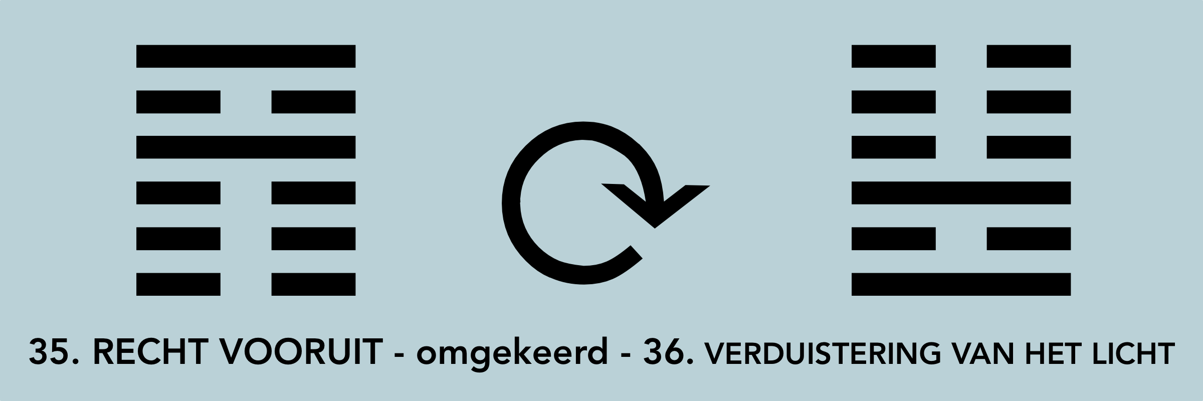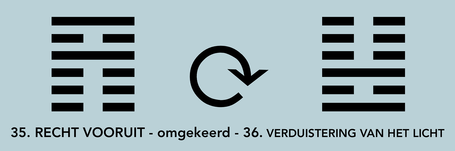Ieder extreem kan immers zomaar in het tegendeel flippen. Draai het hexagram van Recht Vooruit om en het beeld van Hoofdstuk 36. De Verduistering van het Licht verschijnt: Vuur ònder Aarde.