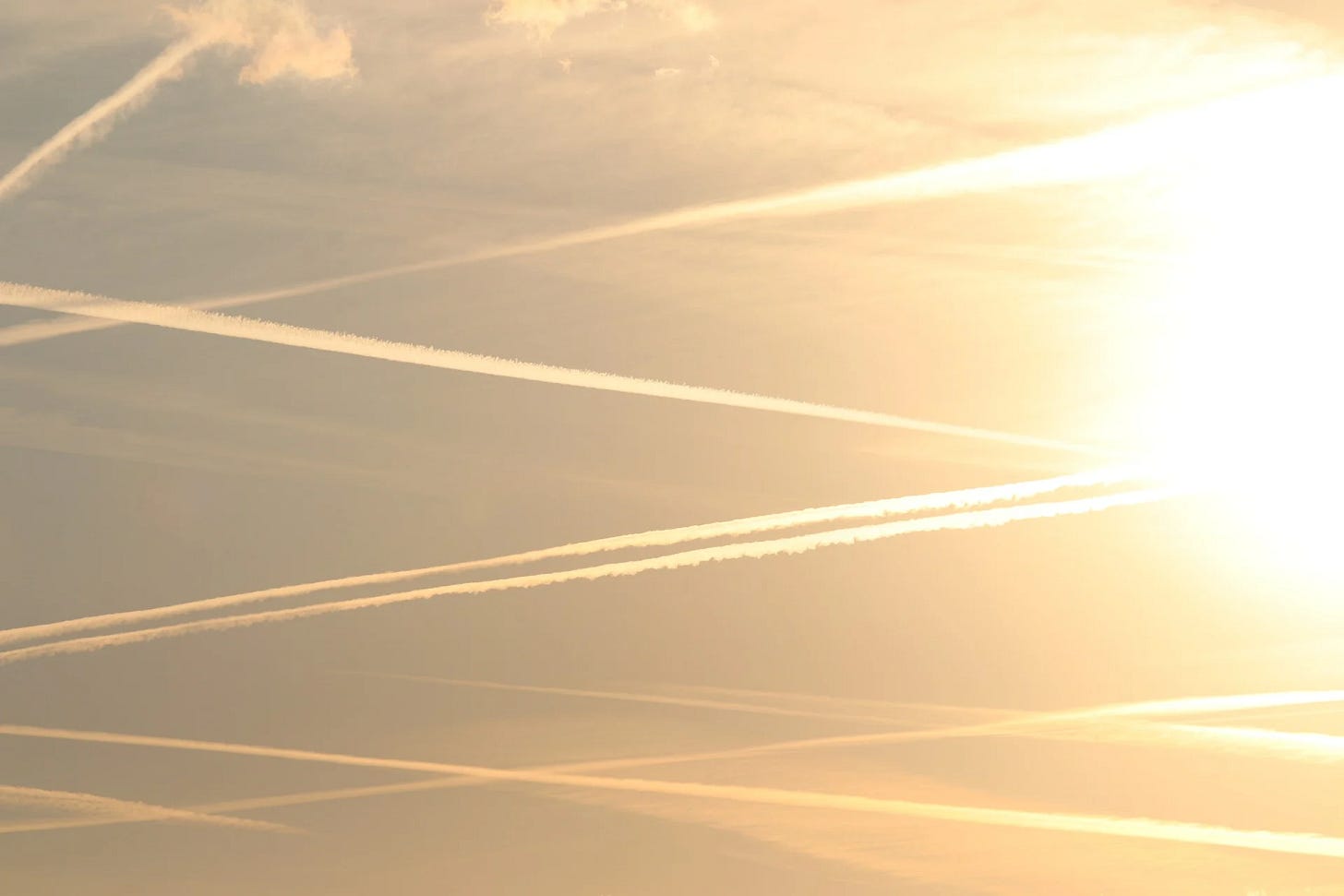 Kaarsrechte spoorlijnen op de aarde, langs een liniaal getekende contrails in de lucht