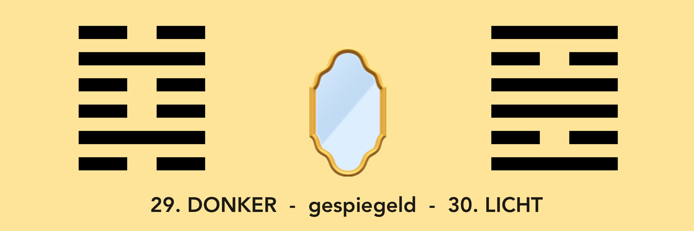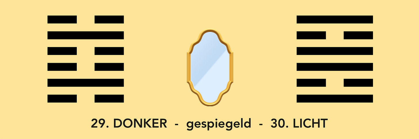 Water en Vuur, Donker en Licht. Hoofdstuk 29 en 30 beschrijven respectievelijk de werelden van het onderbewuste en het bewuste. Maar niet als twee domeinen die elkaar uitsluiten en door een hermetische barrière van elkaar gescheiden zijn. Het trigram van Water bestaat voornamelijk uit vormloze, transparante, lijnen. In hun midden bevindt zich die ene lichte lijn, die van bewustzijn. Het trigram van Vuur heeft een overschot aan heldere lijnen, met in hun midden die ene gebroken lijn, die hen verbindt met de ongerijmdheid van herinnering, geur, instinct en dromen.
